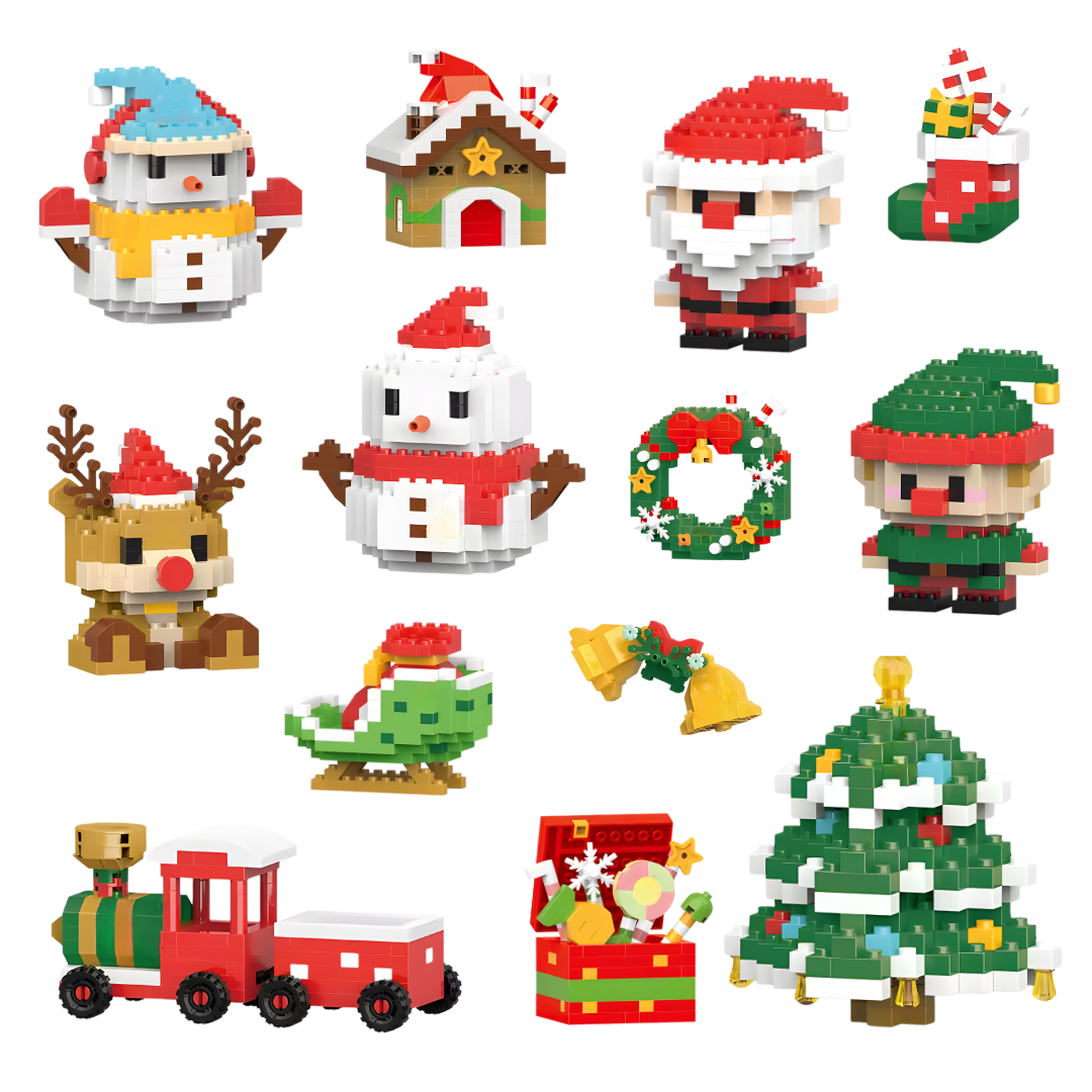 - 12 x Individually Packaged Mini-Build Kits, including:Santa Claus, Snowman, Reindeer, Christmas Tree, Gift Train, Elf, Gingerbread House & More!